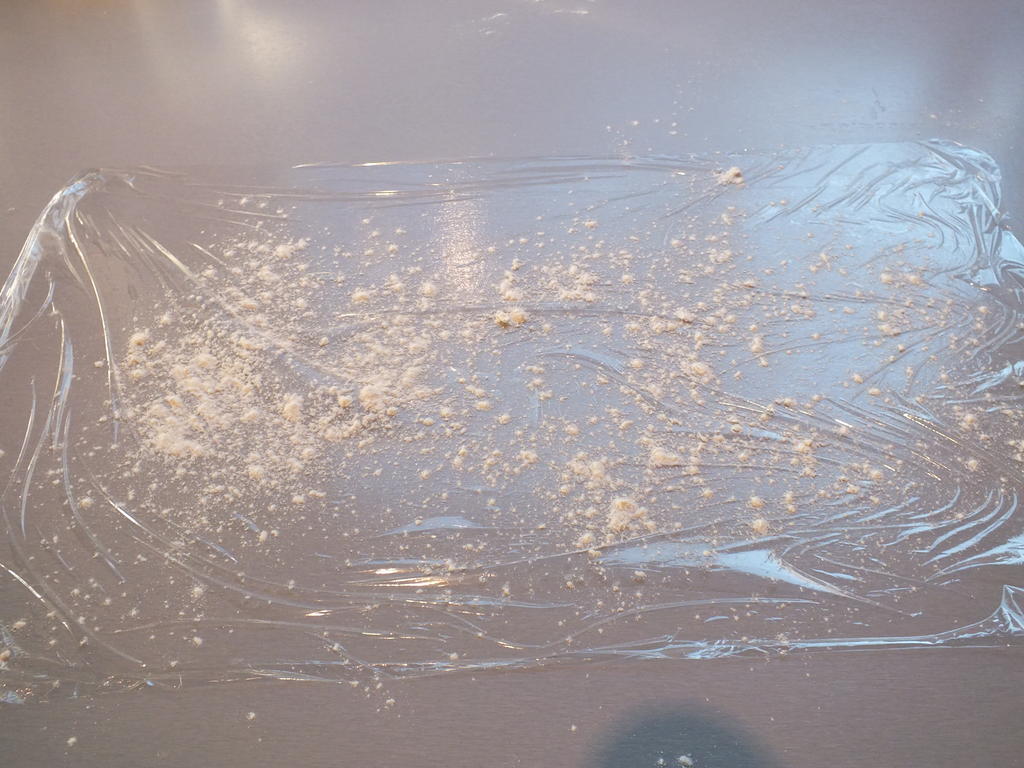 - Fukt benketoppen med en fille eller sprayflaske og legg på plastfolie. Dryss litt mel på folien og ha på deigen. Bruk gjerne en slikkepott for å få med alt, og for å forme deigen