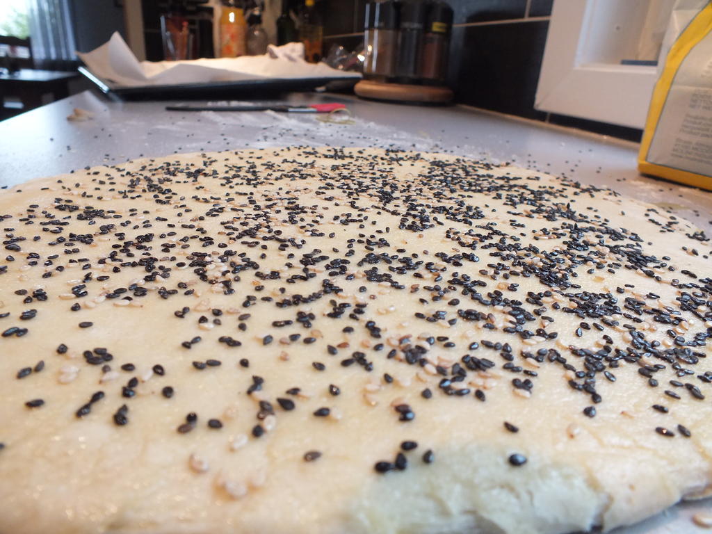 - Pense med olje, har på f.eks hvite og sorte sesamfrø, press disse fast med håndflaten.
