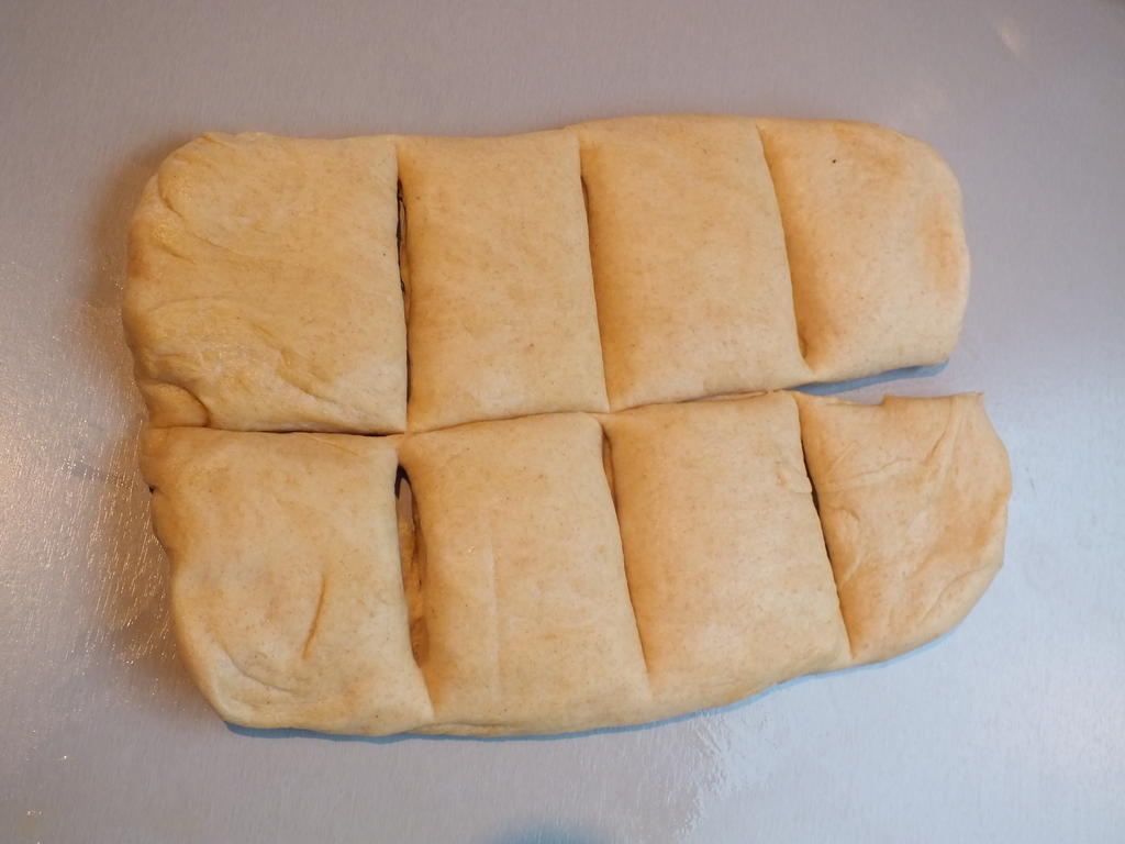 - Ta deigen ut av bollen, lag et rektangel av deigen og del det inn i 8 like store deler