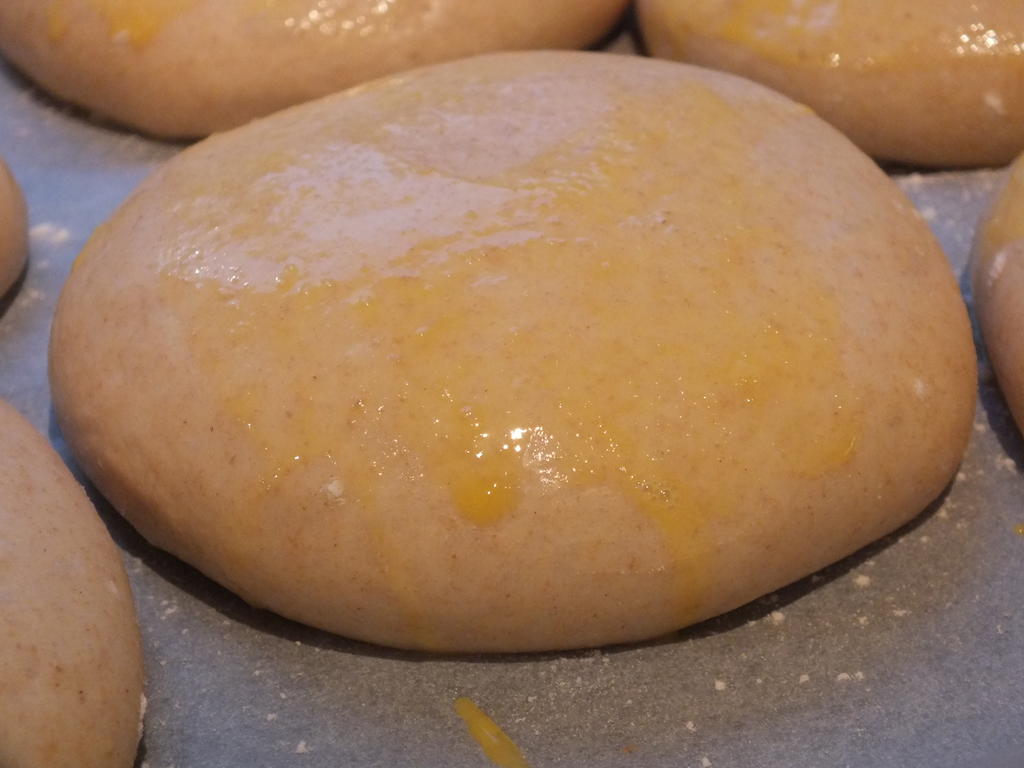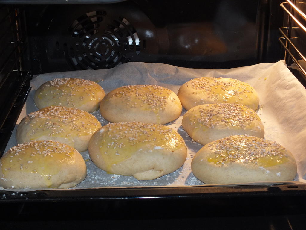 - Med en myk pensel, pensle brødene med denne blandingen. Dryss til slutt over sesamførene