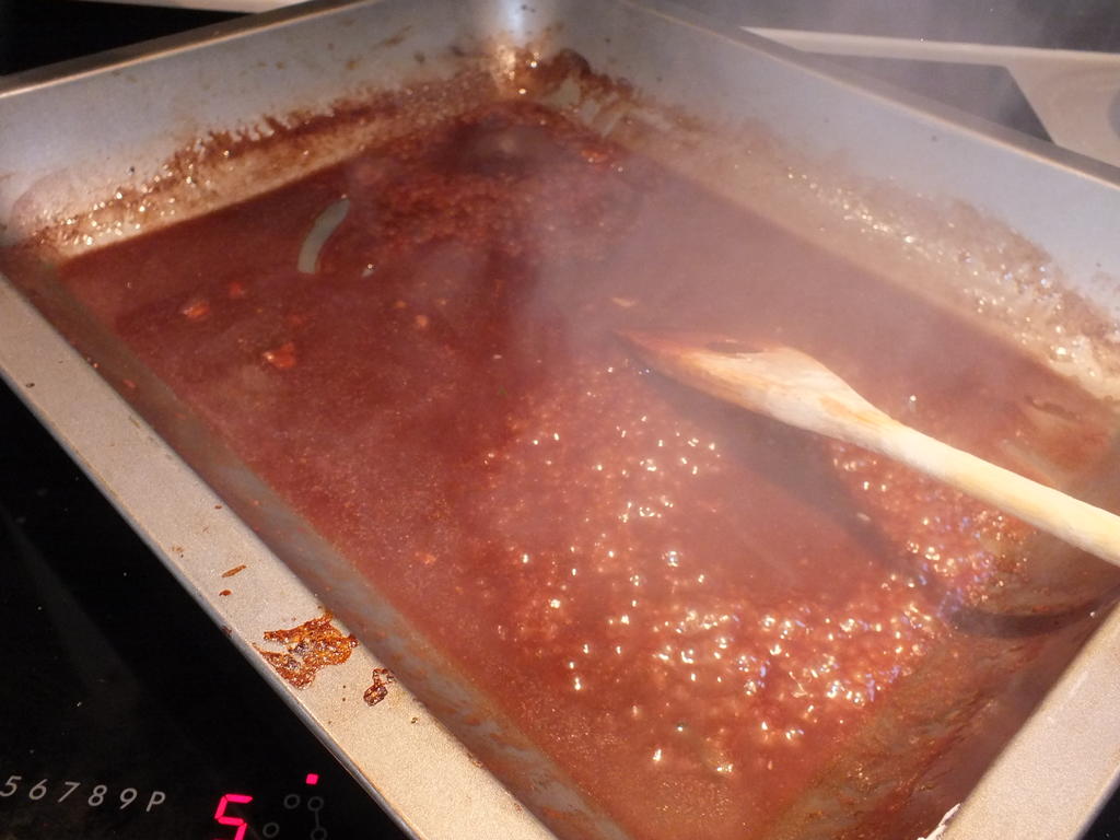 - Skrap løs de karameliserte bitene (glasseringen) av bunnen av pannen med en tresleiv.
