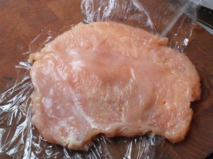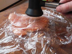 Start med å banke kyllingbrystene flate. Legg dem mellom plasfolie, helst dobbelt, så sparer du deg for mye vasking. Har du ikke kjøtthammer, kan du f.eks. bruke ett kjevle. Målet er at de skal være litt under 1cm tykke, og så jevne som mulig. Hvert bryst deles så i tre ca like store deler.