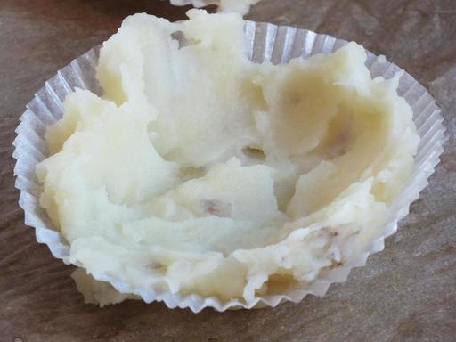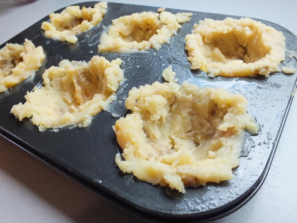 - Når puréen er avkjølt, tas ca 2 ss puré og legg den i en oljet form for, og lag «skåler»
