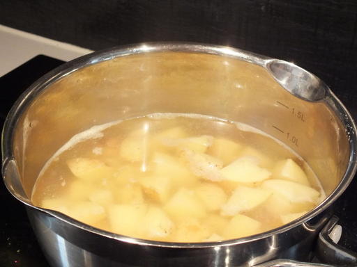- Vask poteten og del dem i terninger . De trenger ikke skrelles. En buljongterning setter ekstra smak