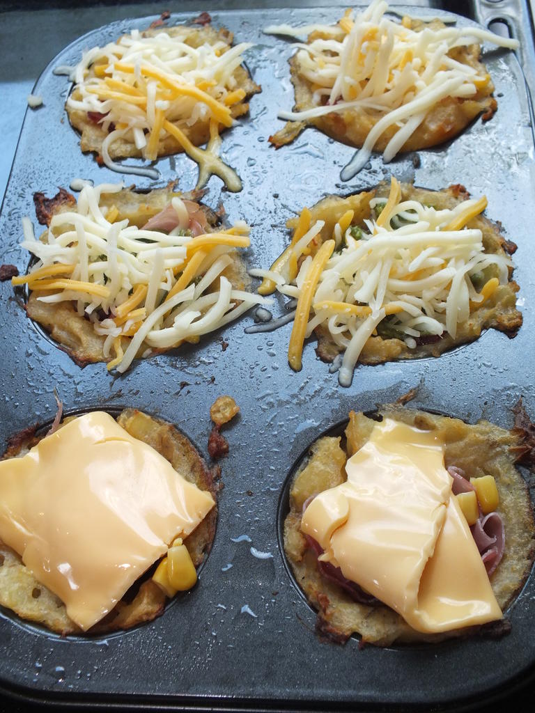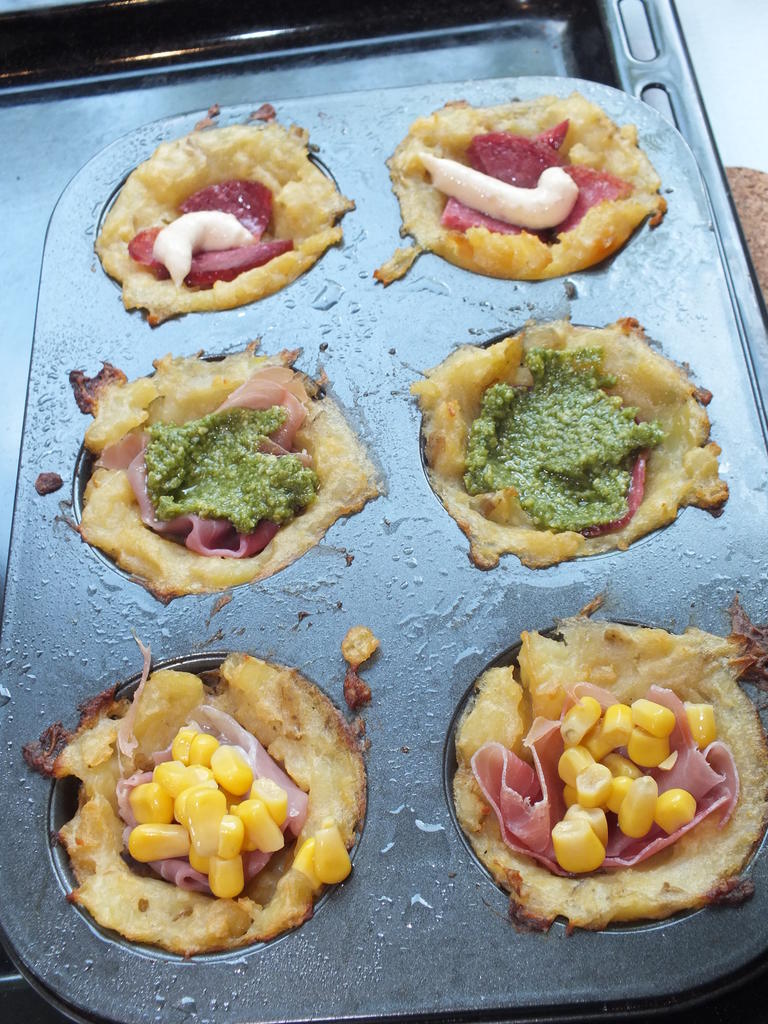 Du kan gjerne bruke røykt ost og spekeskinke til denne, jeg valgte å bruke litt forskjellig fyll. Bruk det du har tilgjengelig og lag din egen vri. Du kan enkelt variere og lage flere forskjellige varianter samtidig. Oppskriften er veldig enkel; jeg hadde noen poteter til overs, og tenkte jeg kunne bruke det til noe neste dag. Dette kan bli en deilig rett, fylt med skinke, eller for eksempel salamiterninger og god ost, og det du ellers måtte ha tilgjengelig. Pynt gjerne med friske urter.