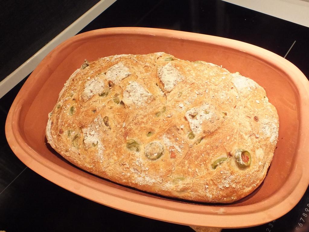 Rustikk olivenbrød i leirkar (romertopf)