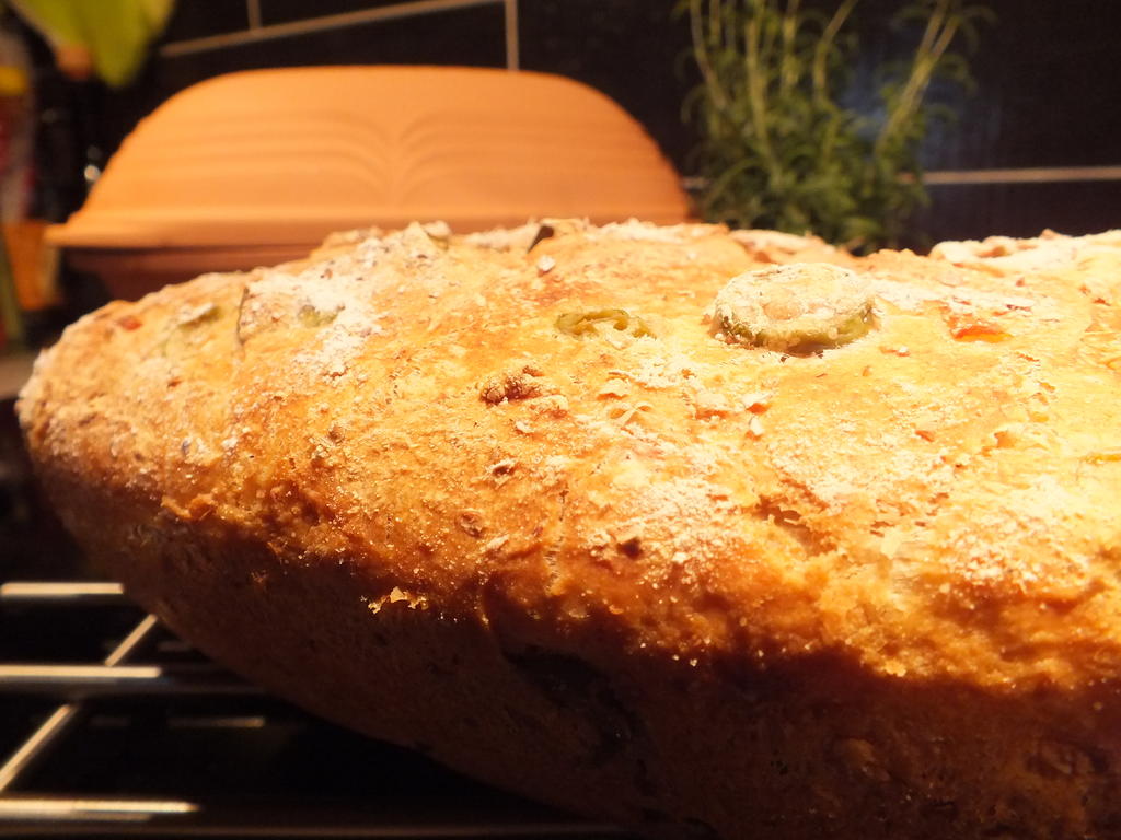 Rustikk og knasende sprøtt olivenbrød – bakt i leirkar.