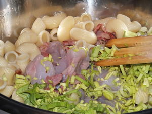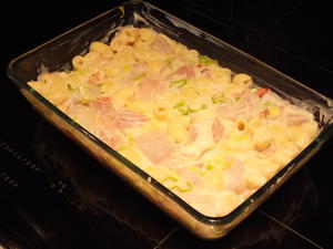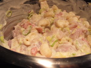 - Ha fisk, makaroni, purre, bacon i en stor bolle og bland.