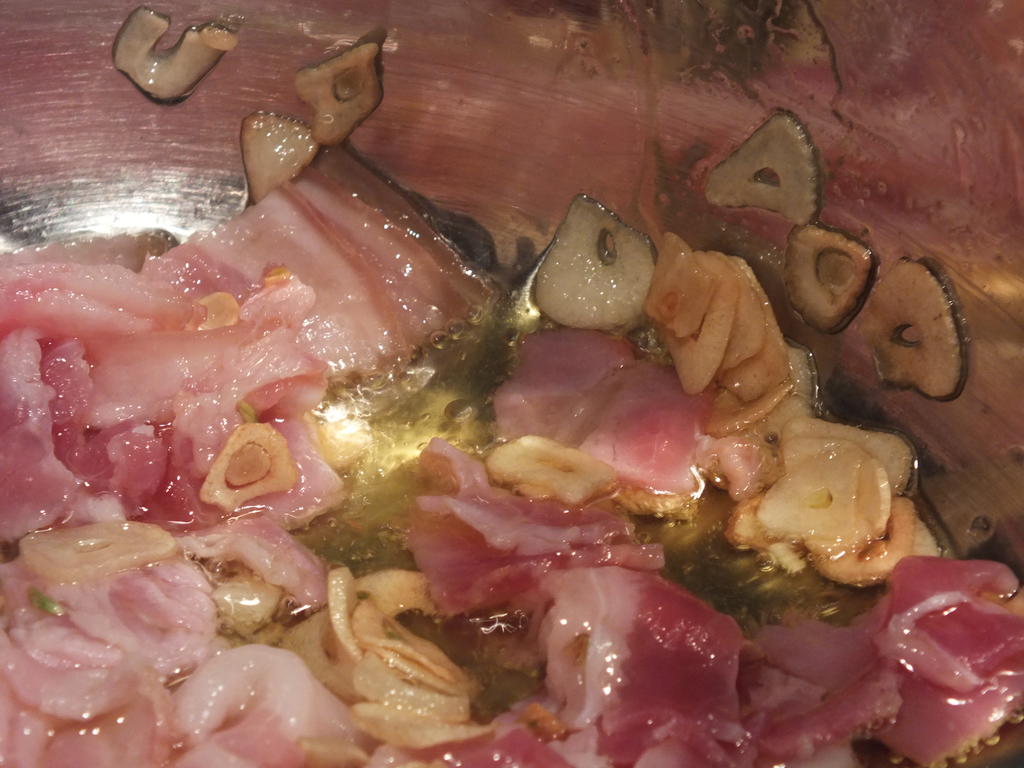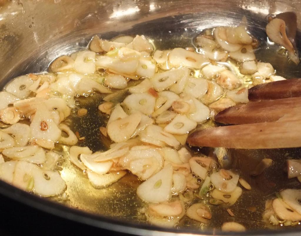 - Ha 0,5 dl olje og hvitløk i en panne og freses til gyllent