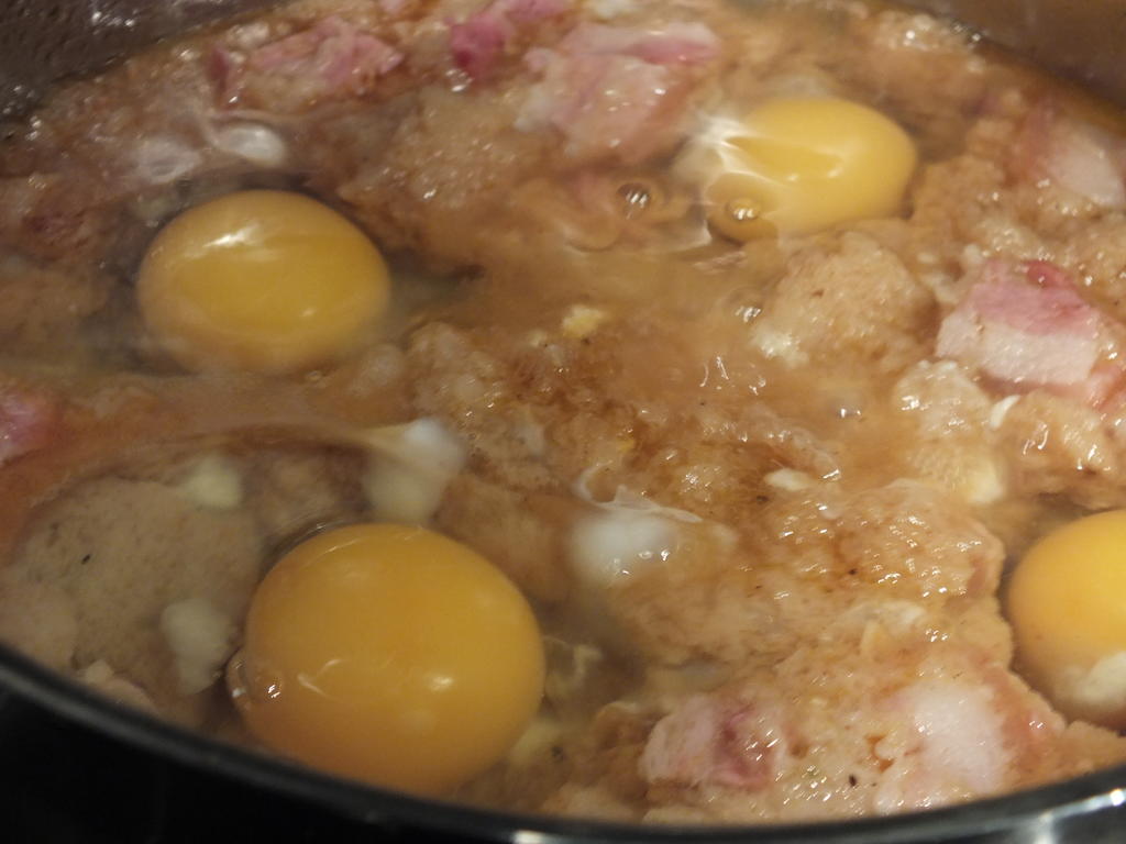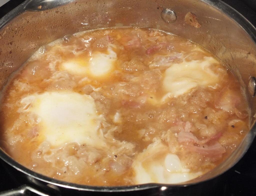 - lag «hull» til eggene i gryten, legg dem forsiktig nedi suppen og la dem koke under lokk til de er kokte